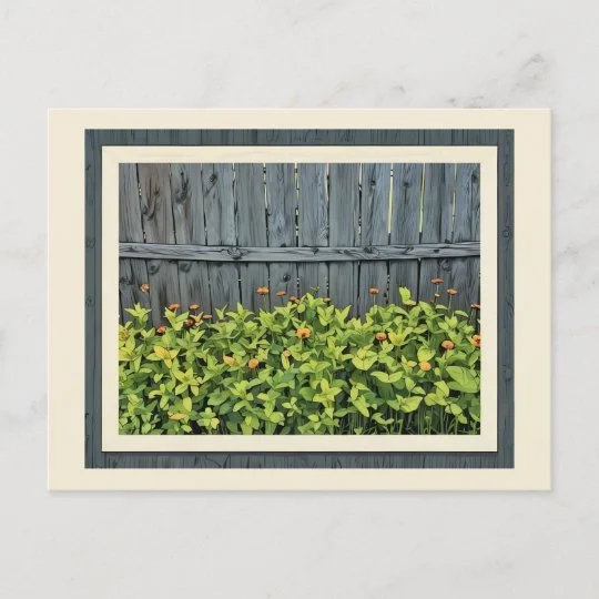 A cute little reminder that growth takes time. Set against a weathered fence, fresh green leaves rise steadily — with small blooms just beginning to appear. This piece speaks to the beauty of becoming and trusting each season along the way. On the back: Be patient with your process. Every season has its purpose. The flowers will come.